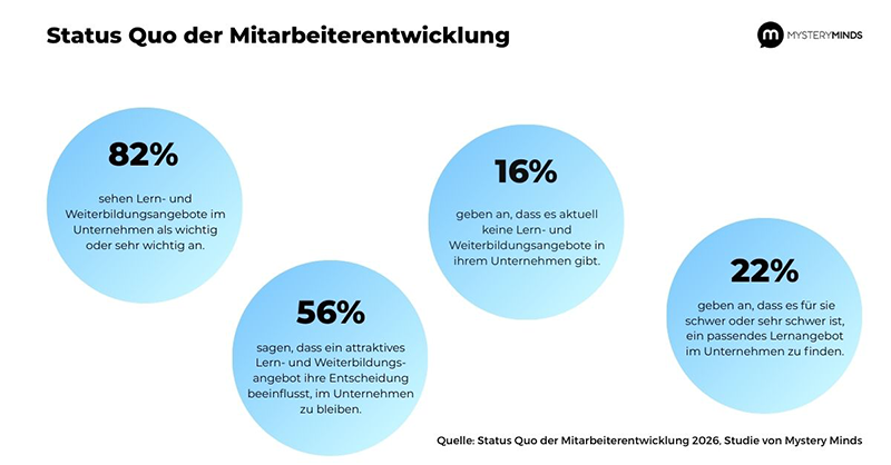 Laut der aktuellen Studie von Mystery Minds und YouGov halten 82 Prozent der Befragten Lern- und Weiterbildungsangebote im Unternehmen für wichtig oder sehr wichtig. Insgesamt 56 Prozent der befragten Arbeitnehmenden geben sogar an, dass ein attraktives Lernangebot ihre langfristige Entscheidung beeinflusst, im Unternehmen zu bleiben. Gleichzeitig sagen allerdings 22 Prozent, dass es für sie schwer oder sehr schwer sei, ein passendes Lernangebot zu finden. Jeder sechste (16 %) führt aus, dass es in seinem Unternehmen aktuell überhaupt keine Lern- und Weiterbildungsangebote gibt.