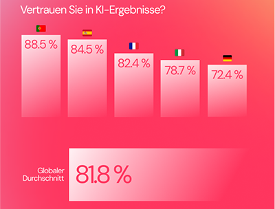 Das Vertrauen in KI ist groß, die meisten nutzen sie aber mit Bedacht. Mit 81 % hat die große Mehrheit grundsätzliches Vertrauen in KI, wobei Portugal (89 %), Spanien (85 %) und Frankreich (82 %) die höchsten Werte aufweisen. Deutschland ist mit 74 % noch der konservativste Markt. Aber auch wenn die große Mehrheit KI grundsätzlich vertraut, übernimmt nur eine Minderheit davon ihre Ergebnisse ungeprüft. Der Großteil validiert sie dagegen erst, bevor er sie verwendet.